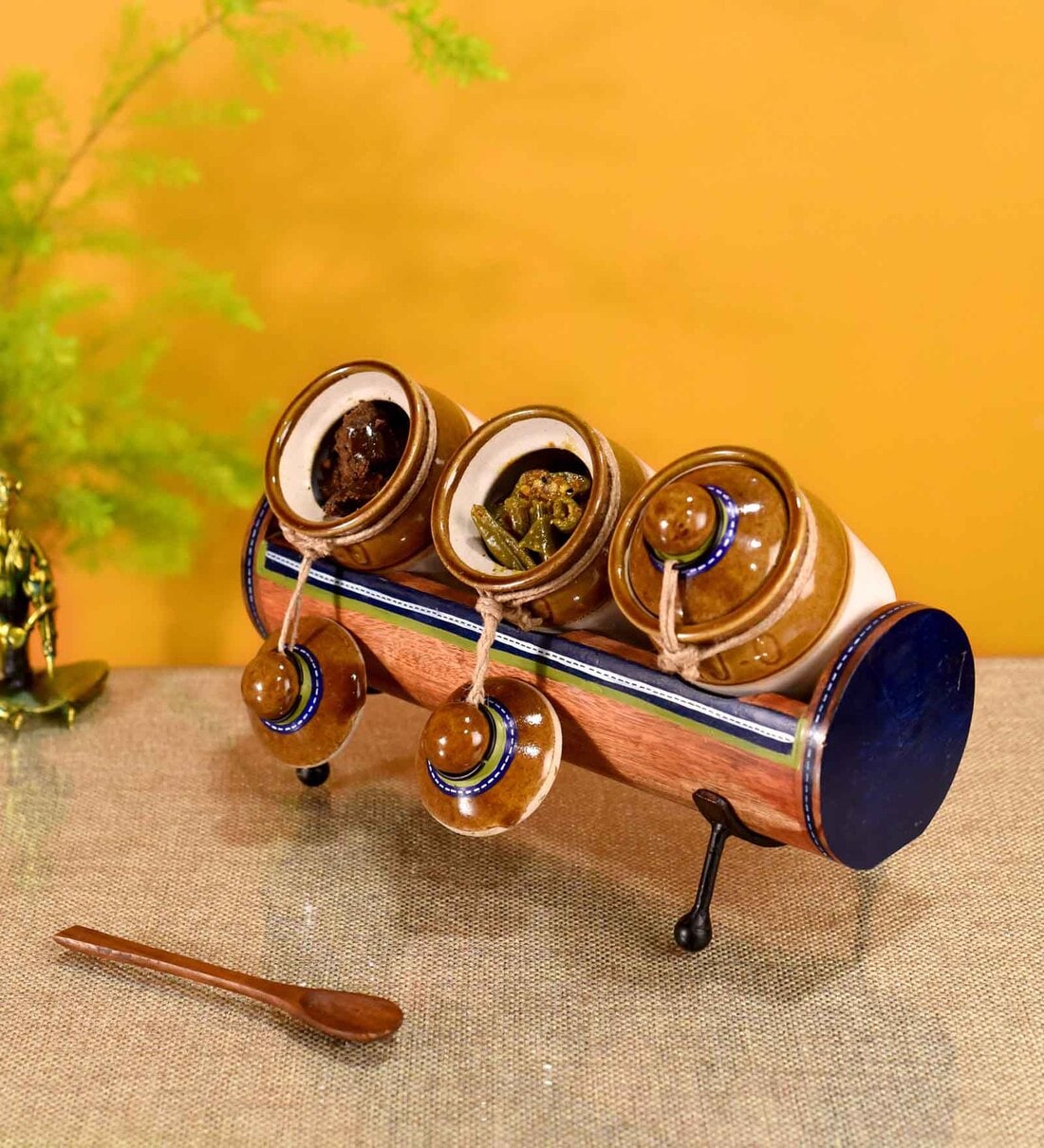 Chatore Blue and Natural Glass and Wood 3Pcs Storage Jar with Stand