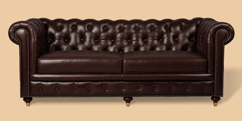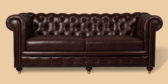 A timeless masterpiece of design and craftsmanship, the Chesterfield Three-Seater Sofa in waxy top grain leather exudes classic elegance. Defined by its deep button tufting, pleated arms, and antique dome rivets, this iconic form is built on a robust wooden frame and features a plush seat with layered foam and latex for enduring comfort. The walnut-stained wooden legs, capped with metal, add a refined finish-perfect for formal living spaces or distinguished lounges.