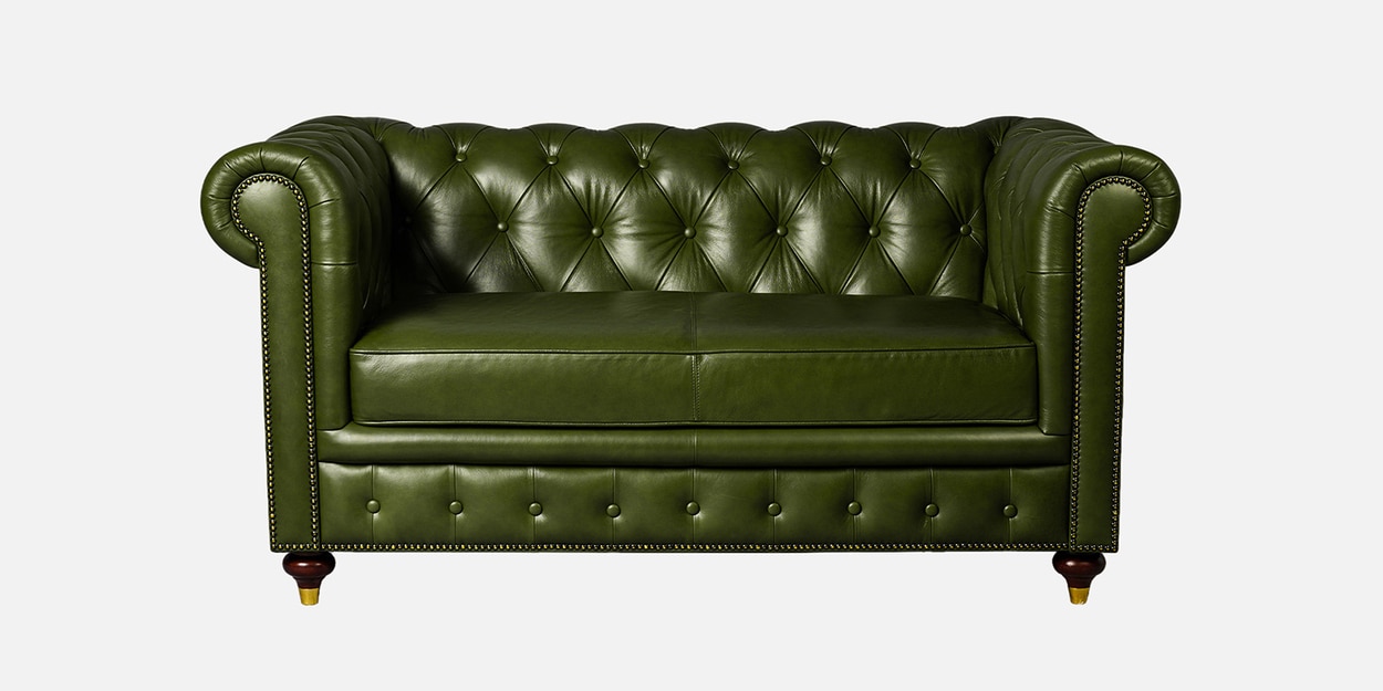 A contemporary expression of heritage design, this two-seater Chesterfield brings refined drama to intimate spaces. Handcrafted in waxy top grain leather with signature button tufting and pleated arms, it celebrates timeless craftsmanship. The inner structure is built with durable Holak and Neem wood, layered with latex and multi-density foam for sink-in comfort. Accented with antique brass dome rivets and walnut-stained legs with metal caps, it's designed for modern luxury with a vintage soul.