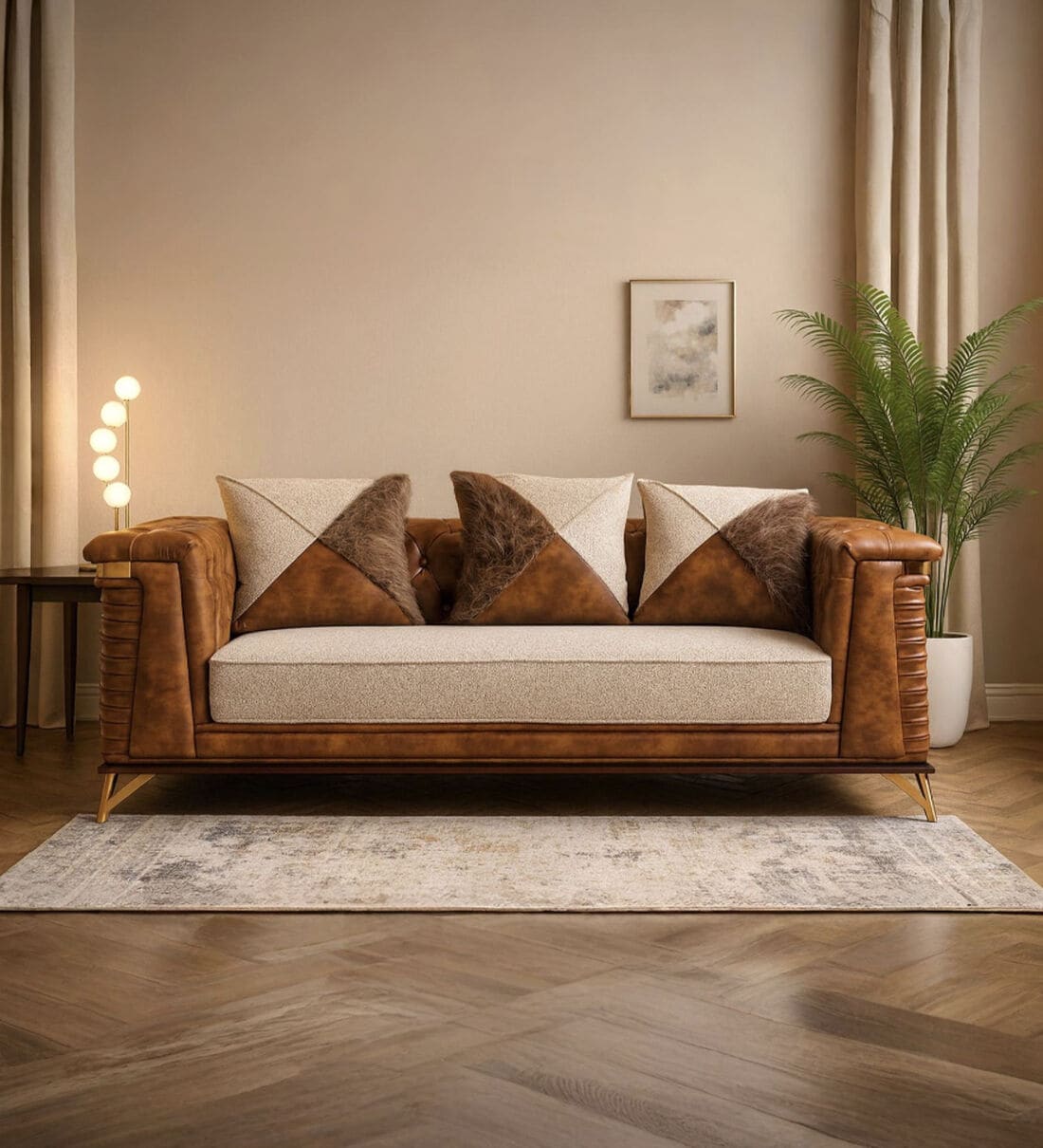 The woven leatherette side panels add a modern twist, while the plush beige seat cushions provide luxurious comfort.