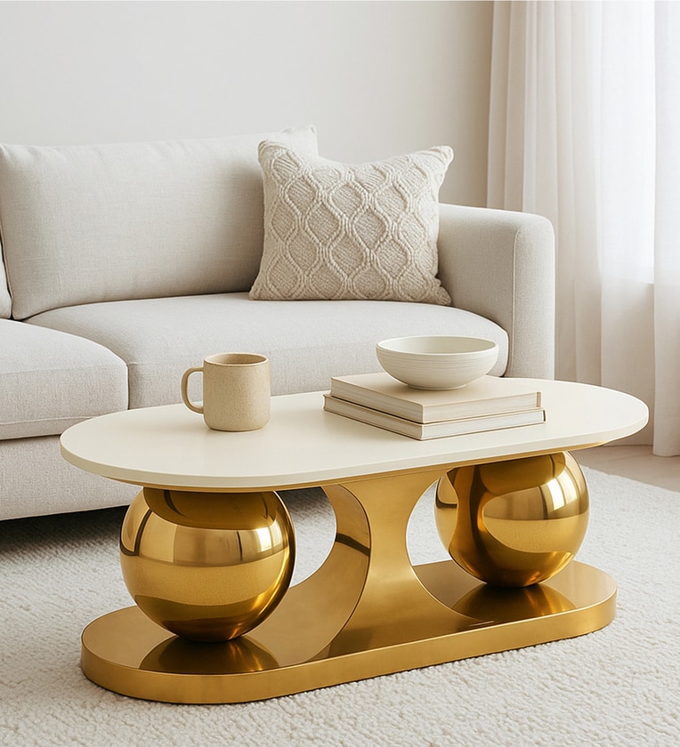 Crafted with precision, the table features a smooth white faux marble top that exudes luxury and durability. Beneath the tabletop, two stunning golden spheres serve as both an eye-catching design element and a structural support, creating a perfect balance of aesthetics and functionality.