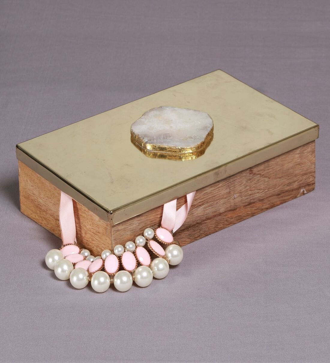 Decorative Box made of wood, metal and has semi precious tone agate on top of it. COLOR OF AGATE STONE MAY VARY FROM THE PICTURE AS THIS IS A NATURAL STONE AND NOT MANUFACTUREDSpecifications:Finish: Natural Wood, Agate, Gold Finished Metal LidMaterial : Wood, Metal, Agate StoneDimensions in cms : (L x W x H) 27 x 17 x 8Sold as Single pieceCare instruction: Clean with dry cloth*Products are handcrafted; there could be slight variation in the product from the image.