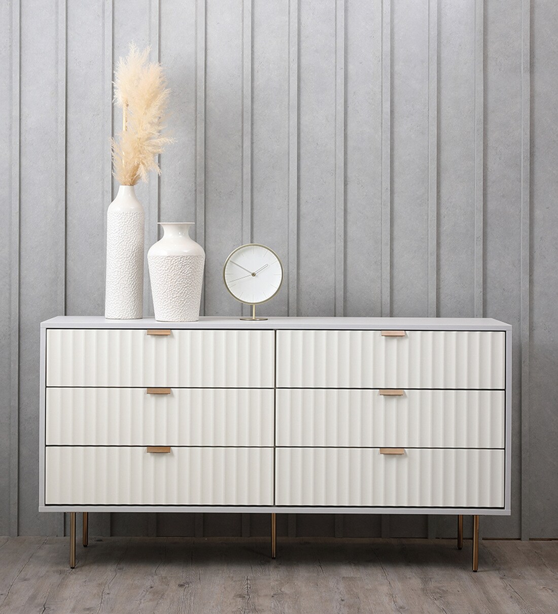- Material : front drawer doors with pattern white paint finished, body and top with light grey melamine, dark gold steel legs, handles with dark gold steel. - Option : 6 ball-bearing drawers with soft close. - Double chest can be used as room divider, or placed in the middle of the room with both sides presentable.