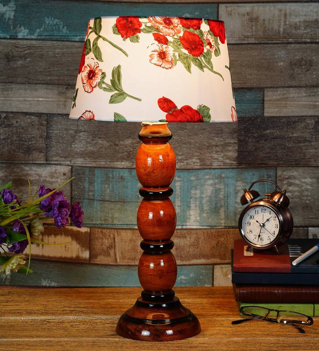 Colonial Red Fabric Shade Night Lamp With Wood Base