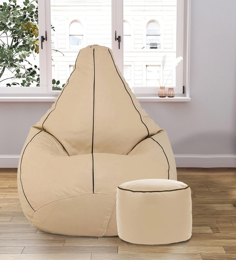 Combo Classic XXXL Leatherette Bean Bag with Beans in Brown piping & Cream Colour with Pouffe