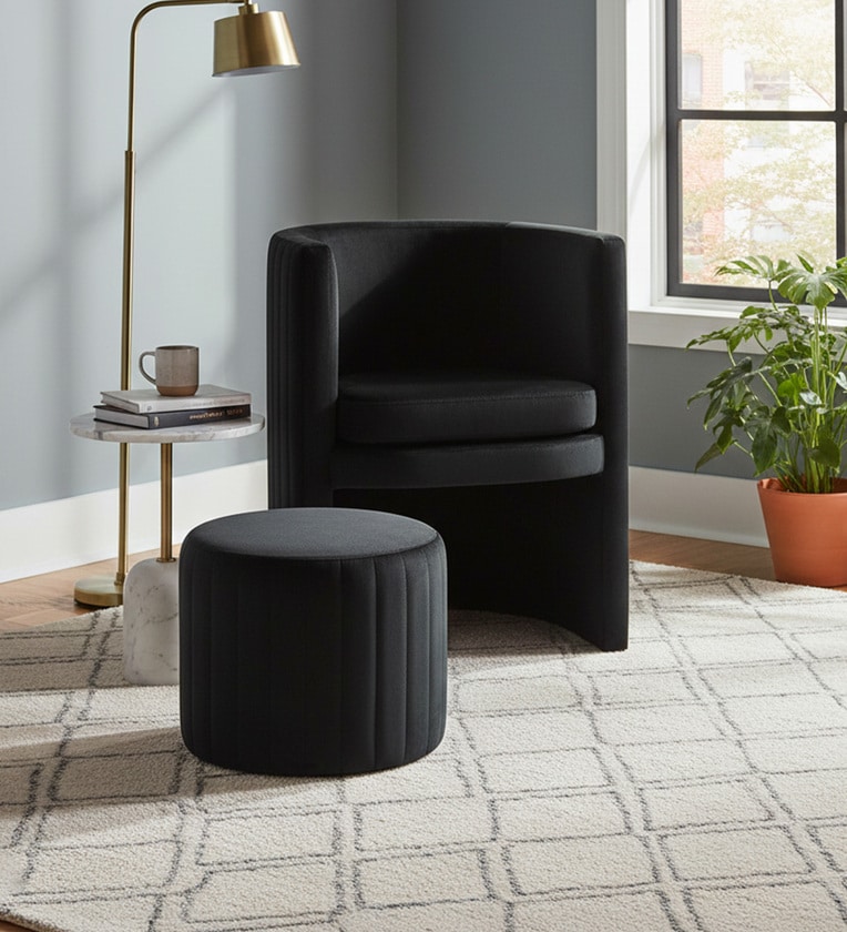Contemporary Luxe Velvet Fabric Barrel Chair With Ottoman Footrest In Black Colour