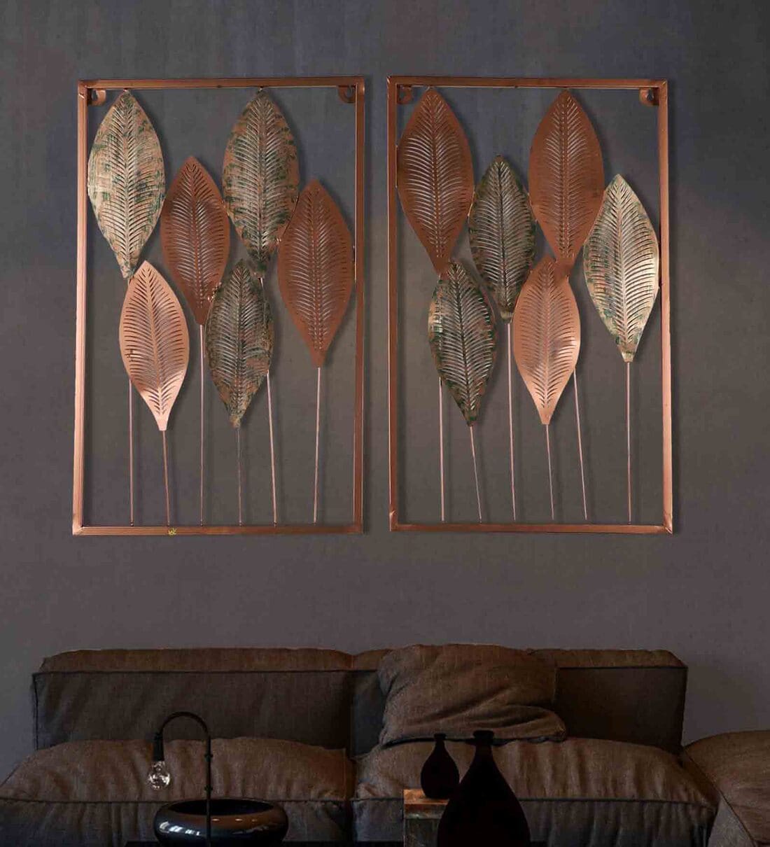 Rectangular Copper & Green Etching Leaves Wall D cor Set of 2