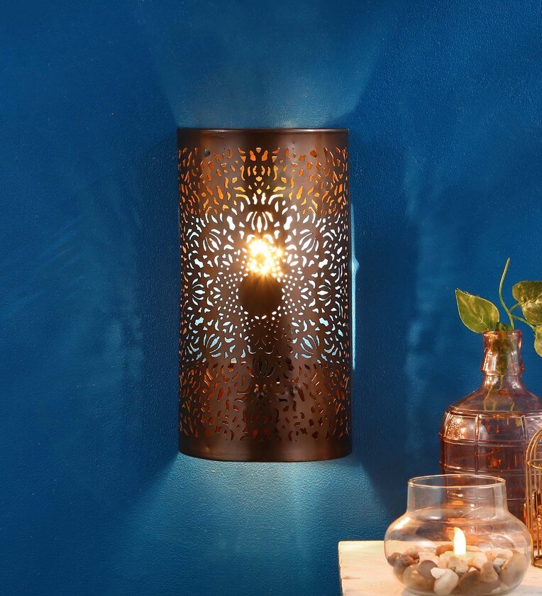 Moroccan Iron Wall lampshade with perforated design to create a beautiful reflection through its beautiful openwork and to illuminate your interior. These lamp shades sit over your existing wall light fitting or we have the wall mounted lighting kit available. There are no electrics within the lampshade. This lamp is forged and carved antiqued brass torch with brass flame creating a spectacular light spectacle. The brass fretwork is hand sawn gives the body and support of the flame , upon which a crescendo of varying sized brases fills. In a natural setting the brass adds a charismatic allure whilst the brass flame gleam in natural light.