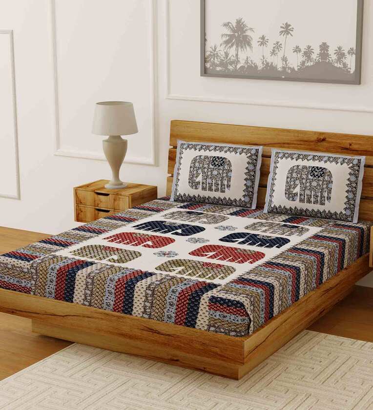 Multicolor Traditional 210 TC Cotton 1 Double Bedsheet with 2 Pillow Covers