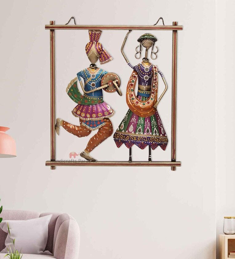 This handcrafted Decorative Couple Playing Dandia Wall Art showpiece helps you to enhance the beauty and charm of your dcor. This product is a must to brighten up your home decor. Every detail matters Clean designs, meticulous craftsmanship, stunning portraits and artefacts, personal touches and colors, and the highest quality materials. Most contemporary and modern design suits your living spaces. The color's of the product may slightly vary. Handmade with Metal the designs are artistically made using best craftsmen techniques. These craftsmen bring generations of traditional art and creativity. It brings positive vibes in the surroundings .The uniqueness and authenticity of each is reflected in small imperfections which are characteristic of handwork. Great gift for your loved ones for Anniversary , birthdays , Diwali , new year .