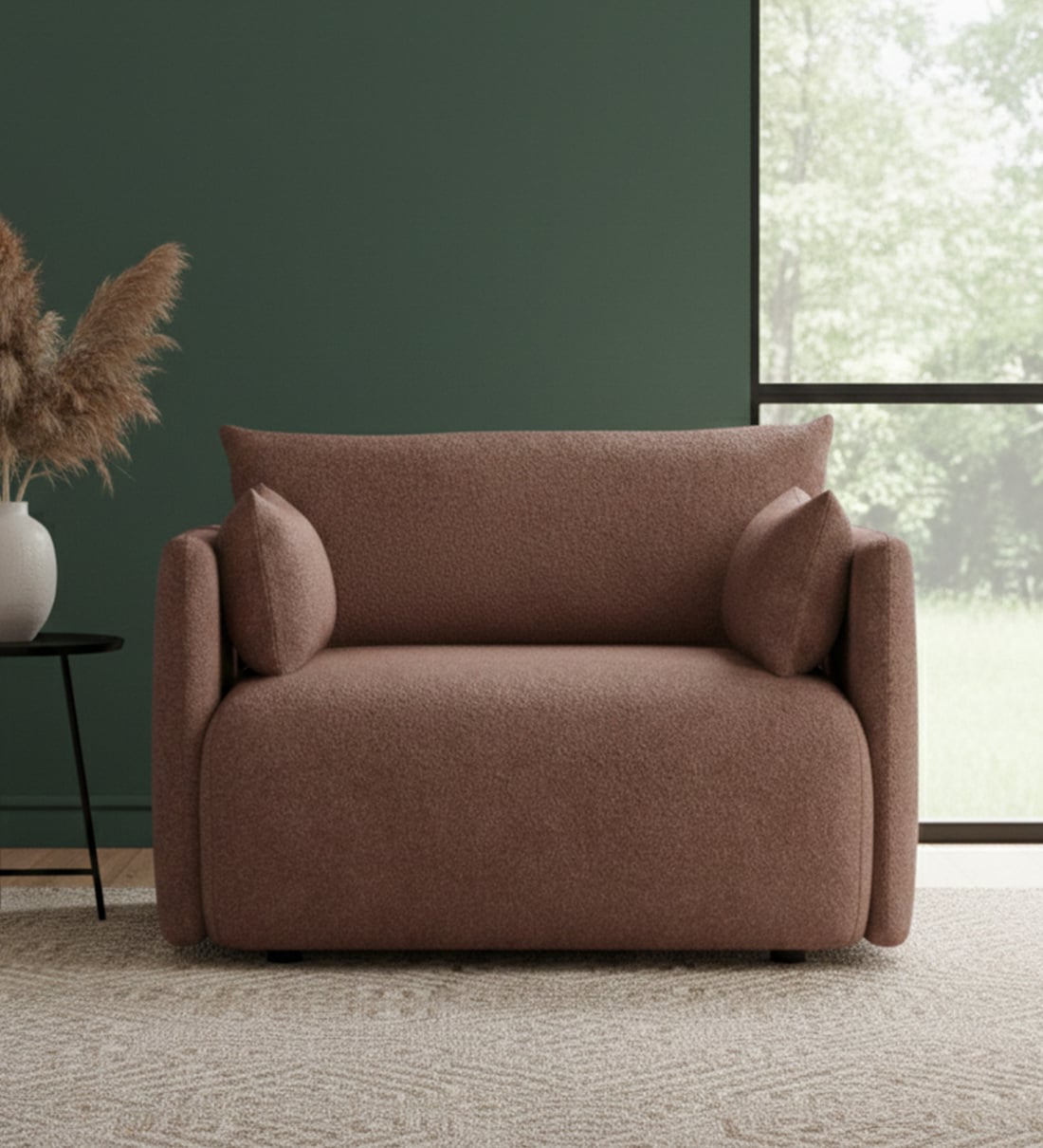 Introducing Nestroots premium single-seater sofa set in a burgundy-colored boucle fabric. Its plain designer accent adds sophistication, making it an ideal accent chair for your living room. Imported for superior quality, this piece combines luxury with premium comfort. Elevate your space with Nestroots exclusive furniture collection, where each item is meticulously crafted to enhance your home with timeless style and unparalleled luxury.
