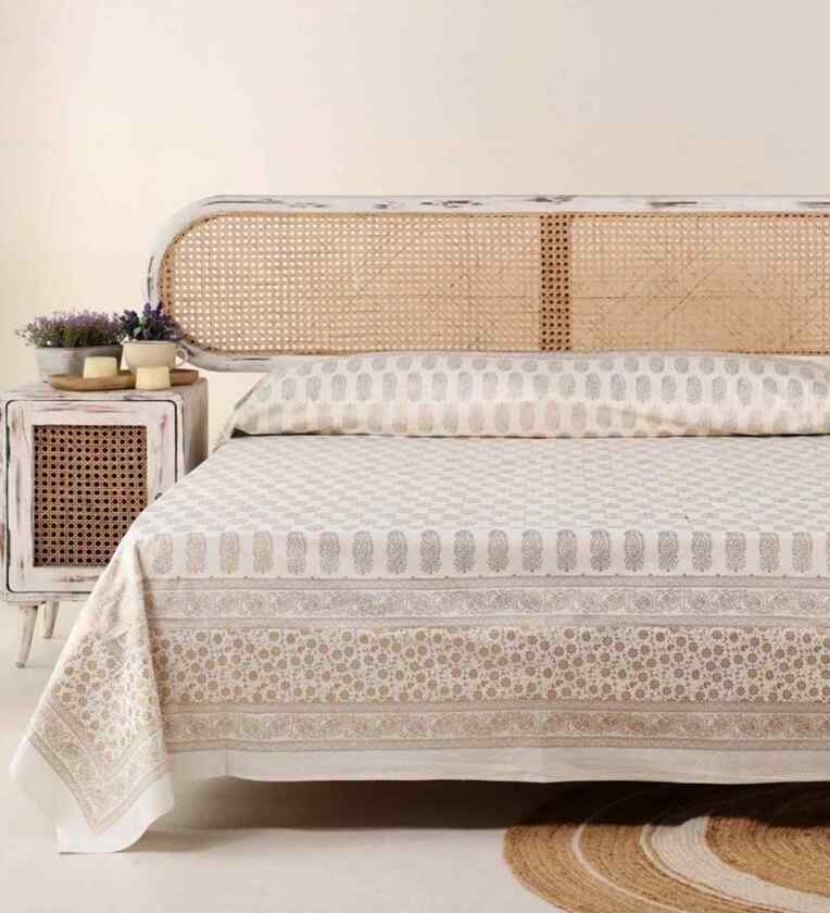 Handprinted Gold & White Cotton King Double Bedcover With Pillow Covers