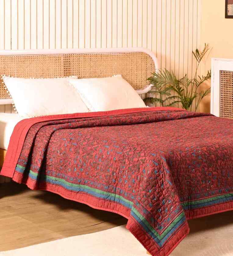 Jaipur Handprinted Quilted Brick Red Cotton King Bed Sized Bedcover Cum AC Blanket