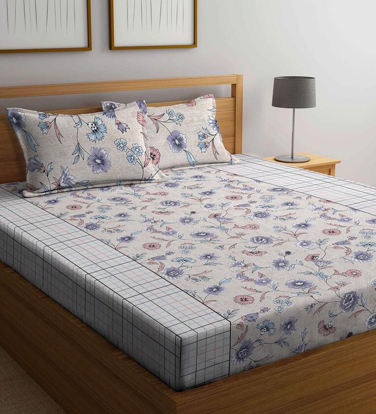 Cream Floral 300 TC Cotton Queen Sized Fitted Bed Sheets with 2 Pillow Covers
