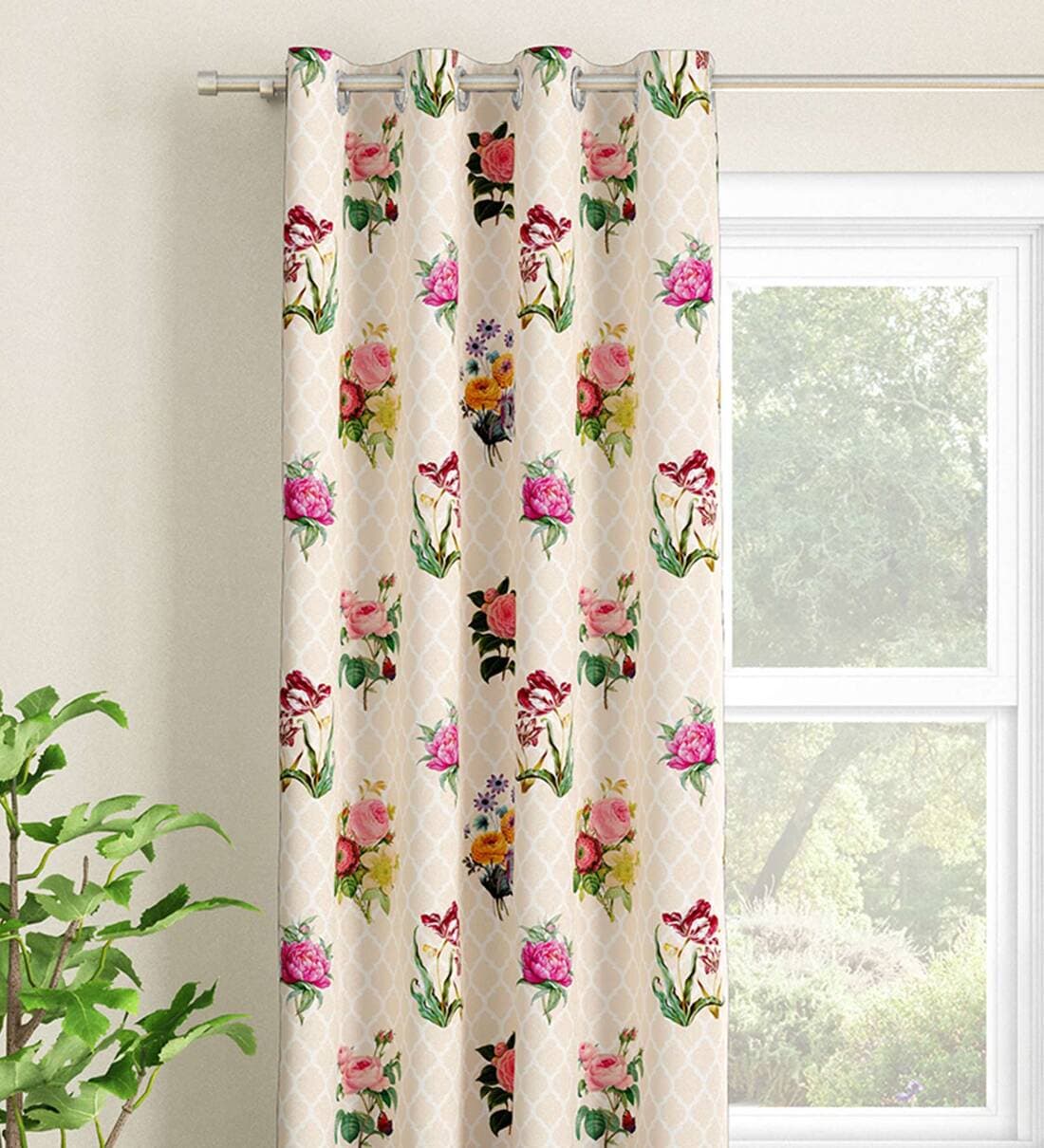 Cream Floral Polyester 7 Ft Light Filtering Eyelet Door Curtain