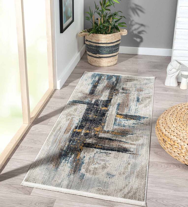 Add a pop of colours to your living or bedroom with this area rug. This easy to clean rug is power loomed from 100% polyester and features an abstract print with splashes of blue, yellow, brown & beige hues.
