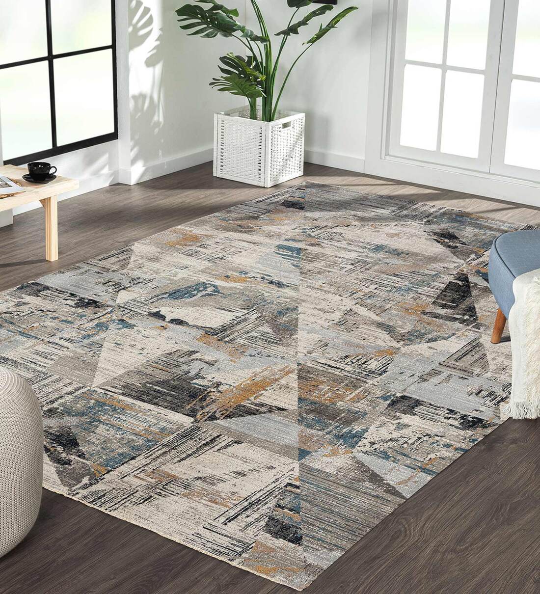 Add a pop of colours to your living or bedroom with this area rug. This easy to clean rug is power loomed from 100% polyester and features an abstract print with splashes of blue, yellow, brown & beige hues.