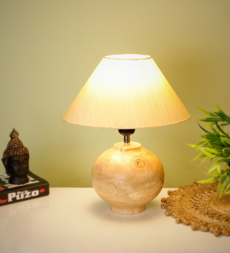 Handmade Wooden Plain Matka lamp in Natural colour. It has a small base and comes with a Plain Beige fabric shade