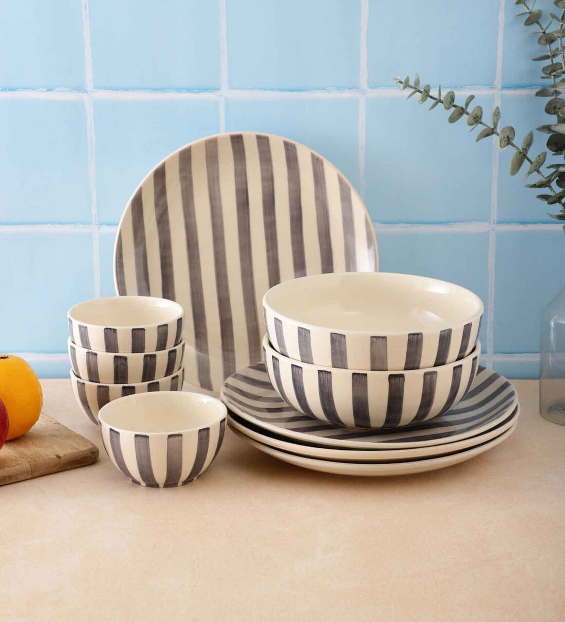 Discover "Crosswalk," a striking ceramic crockery collection that brings a touch of urban flair to your dining experience. Featuring bold grey stripes on a pristine off-white base, this collection mirrors the iconic lines of a crosswalk, blending modern design with timeless elegance. The thick stripes evoke a sense of structured design, reminiscent of cityscapes and modern architecture, while the off-white backdrop adds a touch of classic charm. Each piece offers a unique visual appeal, combining contemporary aesthetics with everyday functionality. "Crosswalk" is perfect for adding a sophisticated edge to both casual and formal settings, making every meal a stylish and memorable occasion. Crosswalk Grey Striped Off-White Ceramic 10 Pc Dinner Set is a part of this classic collection, that is both microwave and dishwasher safe. Made of premium quality clay, this ceramic dinner set is Lead Free and Bone Ash Free and is completely Food Safe. The set contains four full plates measuring 26x2 CMs and four veg bowls measuring 10x6 CMs with each having a capacity of 180 ML. They are complimented by two serving bowls measuring 17.5x7 CMs with a capacity of 800 ML each. Completely hand made in India, this aesthetic series is an excellent choice for Gifting.