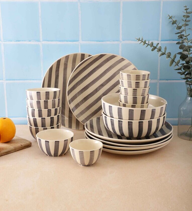Discover "Crosswalk," a striking ceramic crockery collection that brings a touch of urban flair to your dining experience. Featuring bold grey stripes on a pristine off-white base, this collection mirrors the iconic lines of a crosswalk, blending modern design with timeless elegance. The thick stripes evoke a sense of structured design, reminiscent of cityscapes and modern architecture, while the off-white backdrop adds a touch of classic charm. Each piece offers a unique visual appeal, combining contemporary aesthetics with everyday functionality. "Crosswalk" is perfect for adding a sophisticated edge to both casual and formal settings, making every meal a stylish and memorable occasion. Crosswalk Grey Striped Off-White Ceramic 14 Pc Dinner Set is a part of this classic collection, that is both microwave and dishwasher safe. Made of premium quality clay, this ceramic dinner set is Lead Free and Bone Ash Free and is completely Food Safe. The set contains six full plates measuring 26x2 CMs, six veg bowls measuring 10x6 CMs with each having a capacity of 180 ML and six dessert bowls measuring 7.5x5 CMs with each having a capacity of 150 ML. Completely hand made in India, this aesthetic series is an excellent choice for Gifting.