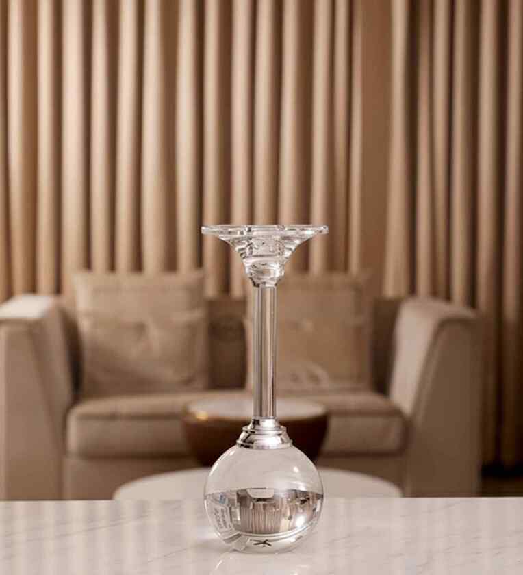 A sleek candle stand, blends simplicity with elegance. It features a tall, slender stem rising from a rounded globe base, topped with a wide, sculpted holder for taper and pillar candles.