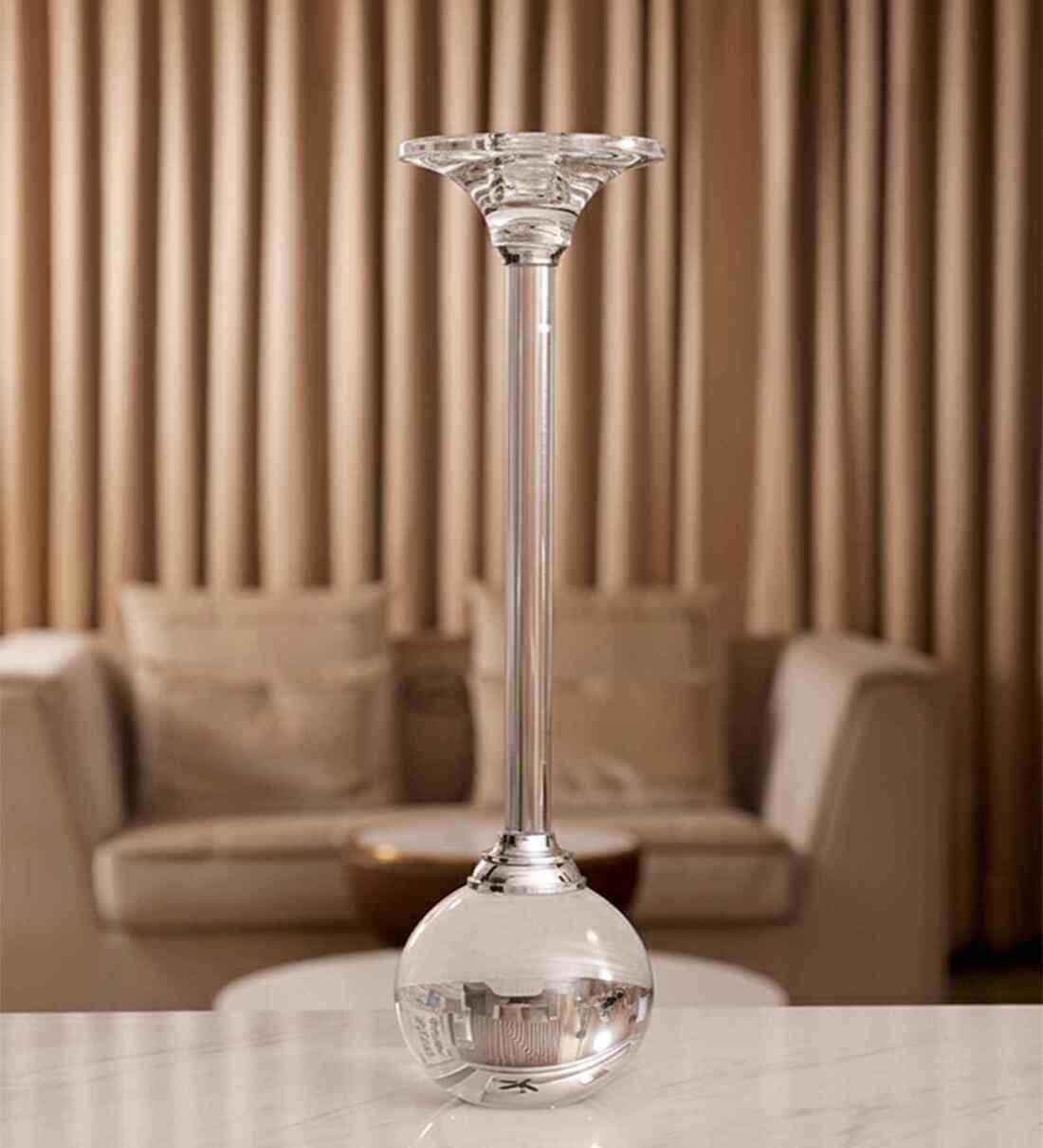 A sleek candle stand, blends simplicity with elegance. It features a tall, slender stem rising from a rounded globe base, topped with a wide, sculpted holder for taper and pillar candles.