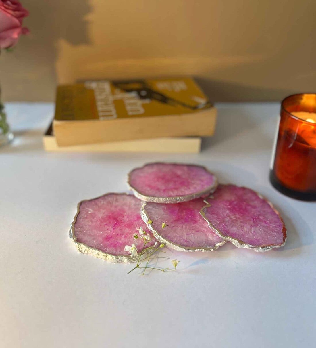 Crystal Agate Coasters, Agate Stone Drink Coasters, Natural Crystal Coasters, Gemstone Coasters, Crystal Healing Coasters, Decorative Agate Coasters, Unique Drink Coasters, Natural Stone Coasters Natural Masterpiece: Immerse yourself in the natural beauty of crystal agate, where each coaster is a one-of-a-kind masterpiece, exhibiting unique patterns and vibrant colors that tell a story of Earth's ancient energies. Versatile Decor: Perfect for both casual and formal settings, these crystal agate coasters effortlessly complement a range of decor styles, from contemporary to bohemian, adding a touch of sophistication to your home. Thoughtful Gift: Share the timeless beauty and positive energies of crystal agate with your loved ones. These coasters make for a thoughtful and unique gift for housewarmings, weddings, or any special occasion. Healing Properties: In metaphysical beliefs, crystal agate is associated with various healing properties, including balance, clarity, and protection. Embrace the potential holistic benefits while enjoying the aesthetic charm of these coasters. Easy Maintenance: Keep these coasters looking pristine with minimal effort. A quick wipe with a damp cloth ensures they remain a stunning addition to your decor.