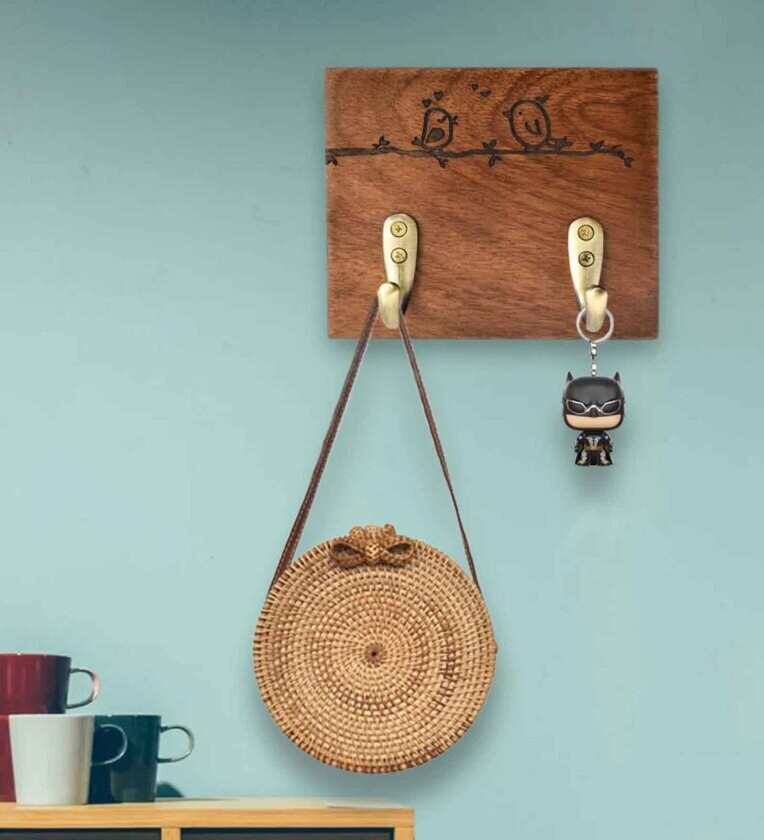 This cute, bird engraved Wood, wall-mounted key holder provides a quick and easy spot to hang keys, dog leashes, totes, and more. Wall Mount Walnut Finish with Bird Pair engraved Wall Shelf. The walnut finish and antique brass finish Hook with a cute bird's pair in love make it exquisite. Great furniture for home decor and great utility. No Assembly is Required, easy to hang, and comes with hardware.