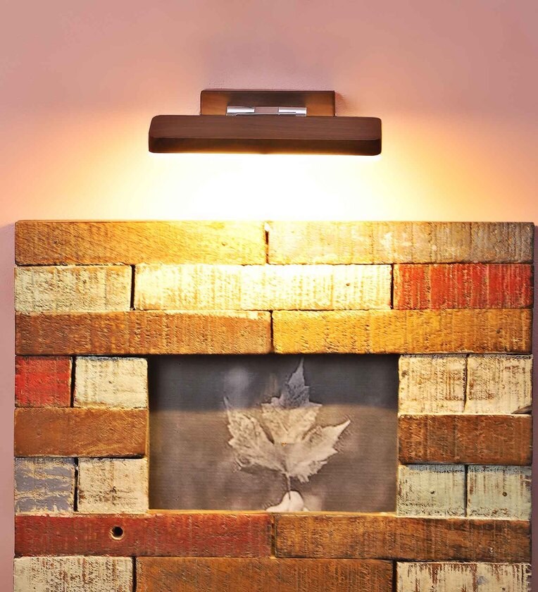Exclusive dark brown (wood finish) LED picture light using high quality LED and driver with high success rate having less than 0.5% replacement with warm white (yellow) light output. It features one adjustible point. It is usually placed over the painting or a photo frame on the wall. Can also be used above the mirror. Its premium quality wood finish makes it one of the best selling product in our catalogue. It can be made in silver, antique, copper, and black finish in case of bulk requirement.