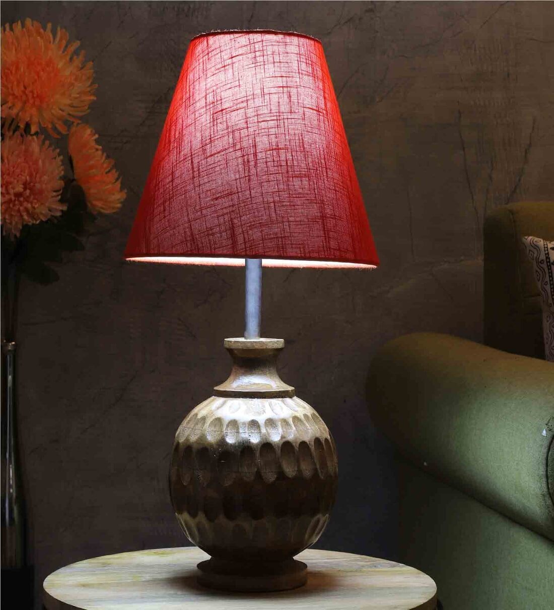 Danica Red Fabric Shade Night Lamp With Wood Base