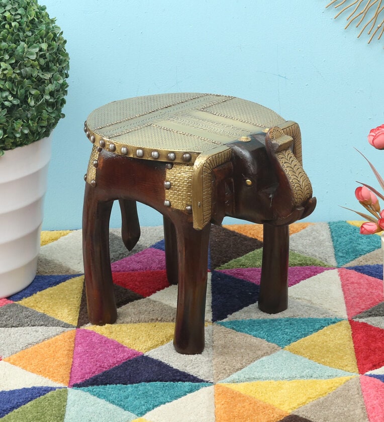 Tale Dark Brown Wooden Brass Metal Polish Big Elephant Stool