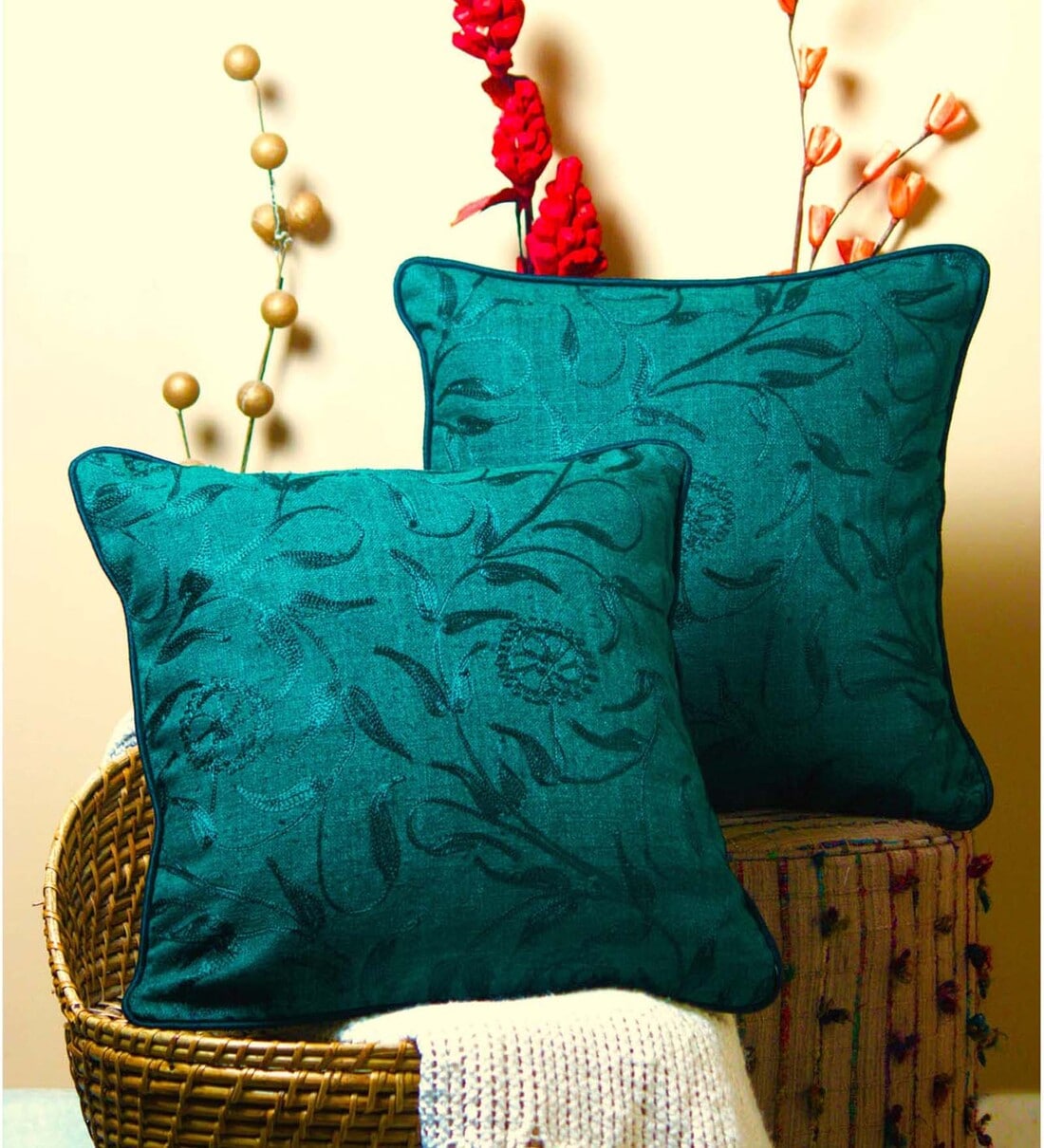 Traditional floral silk yarns embroidery on authentic matka silk in beatiful bold colors. Very elegant covers that will make the space around them bright and soothing.