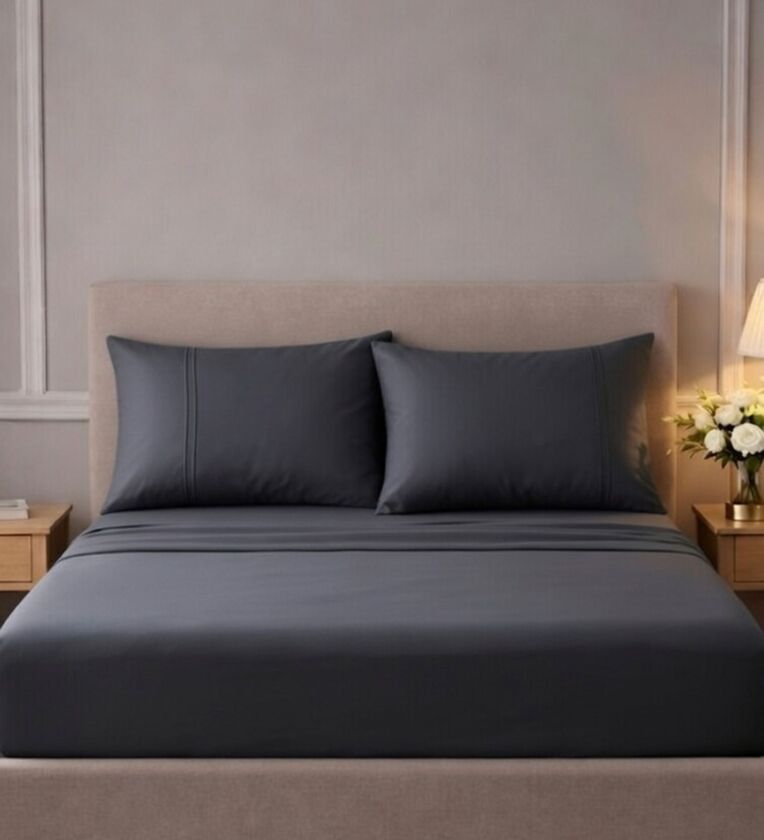 Dark Grey 400TC Solid Embroidery Superking Bedsheet with 2 Pillow Covers