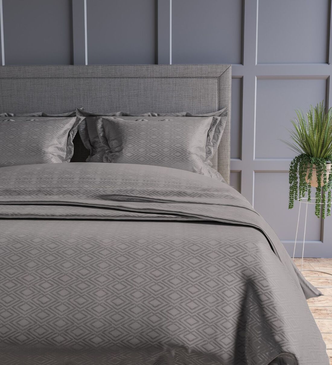 Dark Grey Geometric 300TC Cotton Super King Sized Double Bedsheet with 2 piping Pillow Covers