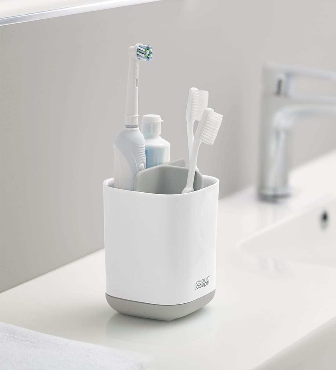 This neat toothbrush caddy is divided into three sections providing organised storage for a variety of oral care items such as manual/electric toothbrushes and toothpaste tubes. It dismantles for easy cleaning and features a ventilation hole for quick drying and a non-slip base.