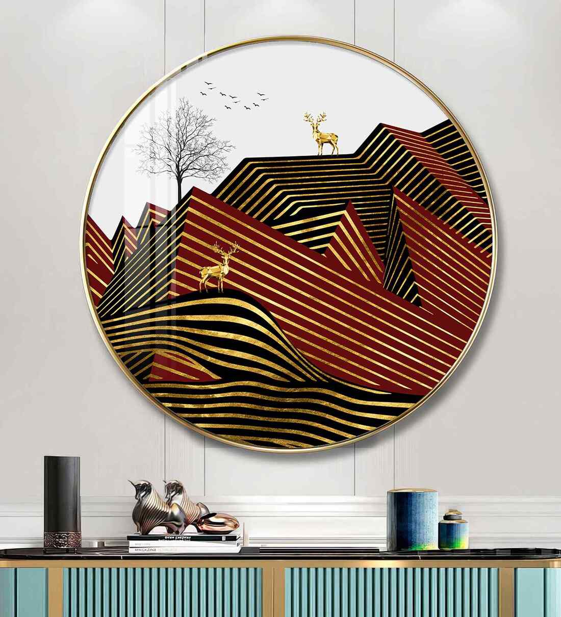 Bring home the timeless elegance of nature with our Deer and Mountain Wood Glass Finish Round Wall Art . The vibrant hues and intricate detailing of the design, a perfect balance of grace and grandeur, making it a captivating centerpiece for your living room, hallway or bedroom. Designed to symbolize prosperity, beauty, and positivity. High-definition print, Durable long-lasting quality material wall art perfect for modern and traditional interiors