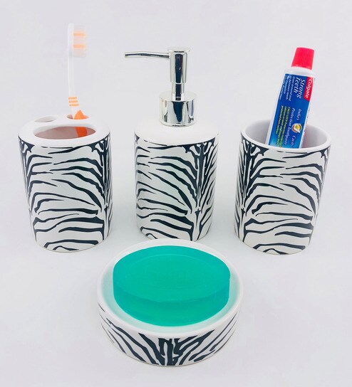 Perfect for storing your toiletries and adding style to your bathroom counter, A gorgeous 4-piece bathroom counter accessories set made of ceramic, PACKAGE CONTENTS : 1 Soap Dish Holder, 1 Toothbrush Holder, 1 Tumbler, 1 Soap Dispenser