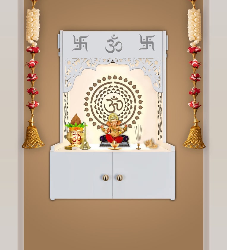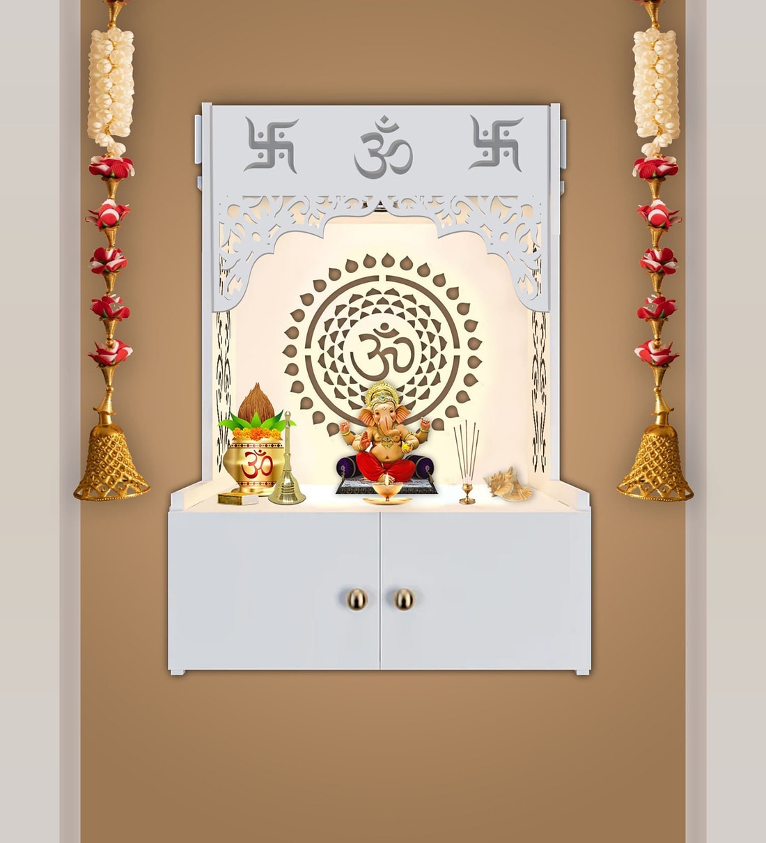 Designer Om Chakra White Wood Temple with Inbuilt Focus Light & Spacious Shelf