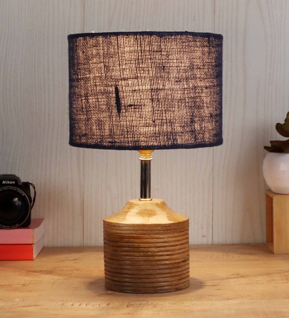 Devansh Wood Table Lamp With Blue Jute Shade