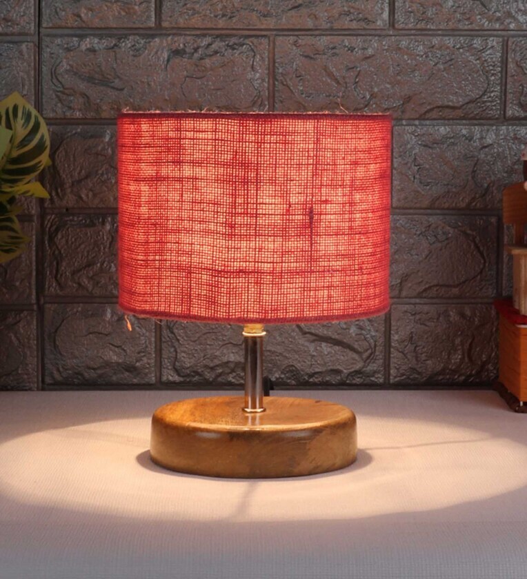Devansh Wood Table Lamp With Pink Jute Shade