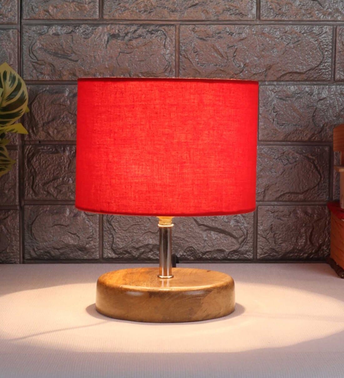 Devansh Wood Table Lamp With Red Cotton Shade