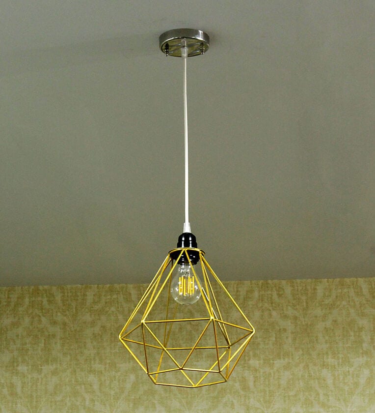 Product Description- This is a very cool and exciting source of Hanging Light! Totally unique.It has been finished in a metallic that really makes it look very realistic. It coordinates beautifully with Ceiling plate.This beautiful Handmade Shade is artfully created with a beautiful design. This Hanging Lamp is made out of iron wires which is being treated and process so that it is a RUST FREE lamp and is perfect for someone to look their light on the ceiling. The Ceiling Light is instantly ready to plug into any outlet, making for a fast and easy install. It look nice next to the bed or in the living room.Material: Iron, Colour: Gold, Dimension(LxWxH): 10 inch x 10 inch x 09 inch, Wire lenhth : Wire Length can be Adjustusted,
