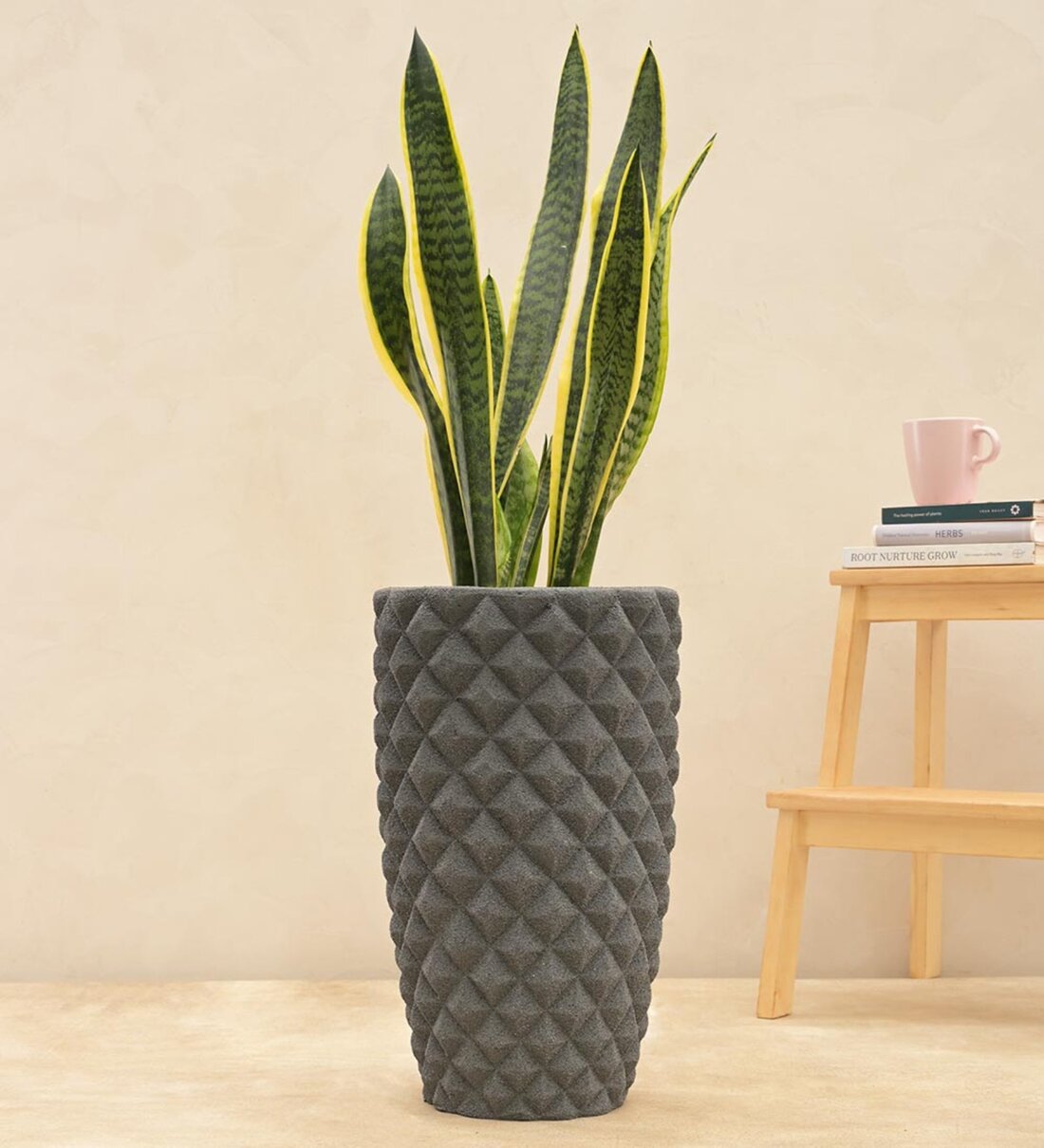 The diamond high planter is every gardener's dream come true with their light weight construction and easy to use design. Made of highly durable fiber glass reinforced plastic, the diamond high planters have diamond shaped honeycomb finish lending it a rich sophisticated feel that adds interest to both indoor and outdoor spaces. The elongated urn like shape of the planter compliments all plants whether they grow tall or trail down its walls. With its premium and eye-catching details, these planters are also a great fit for office spaces. They can be cleaned easily with soap and water and can be placed in clusters of 3 planters or more in different colours and sizes to create a landscaped corner. This indoor pot is completely recyclable and lasts for years in all weather conditions.