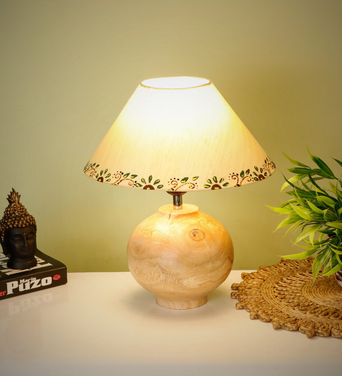 Handmade Wooden Plain Matka lamp in Natural colour. It has a small base and comes with a Beige fabric shade with a Handpainted Border