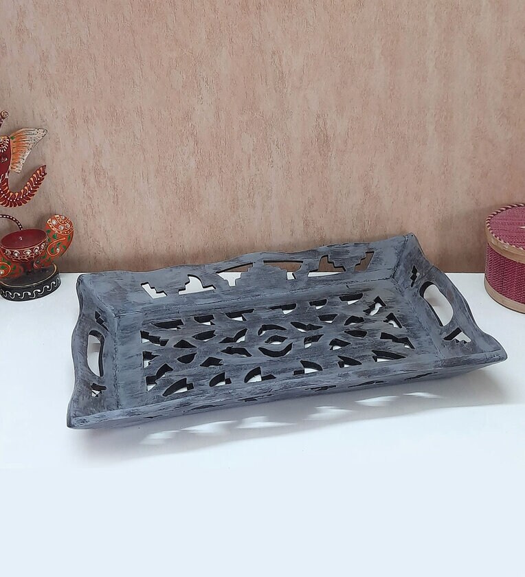 Distress Handcarved Grey Rustic Handpainted Wood Serving Tray