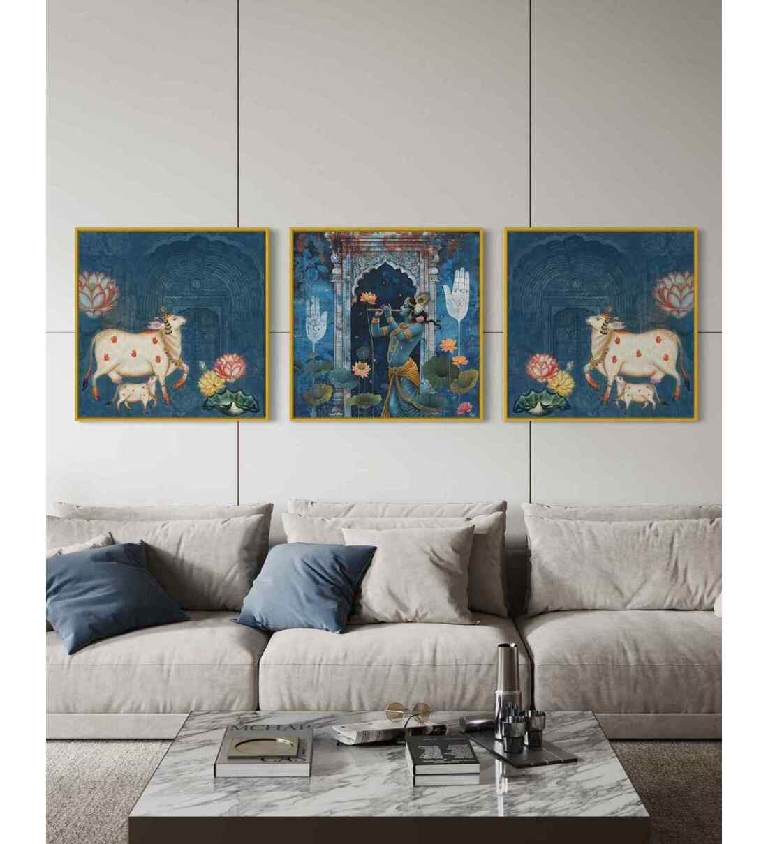 Discover the divine grace of our Krishna Pichwai Canvas Set, a captivating collection that brings the essence of traditional Indian art into your home. This set includes three canvases, each beautifully depicting Lord Krishna in the center with two cows on either side. The canvases come in One sizes: 32x32 inches (81.3x81.3 cm). Frame -White Floating frame