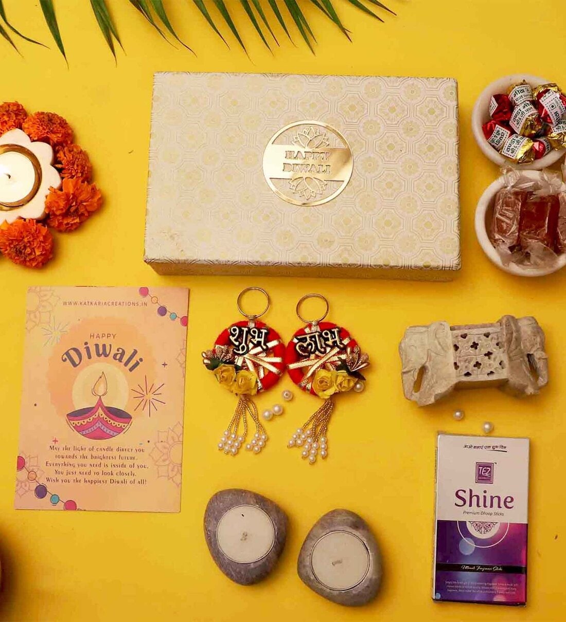 Celebrate Indian Handicrafts with Friends and family by gifting this exclusive Diwali gift hamper designer by Katkaria Creations for the Festive Season. Our Diwali Gift Hamper is a thoughtful blend of tradition and modern pampering, making it the perfect choice for festive celebrations. Diwali Gift Combo Includes : Soapstone Elephant Incense Holder, Pebble Tealight Holder, 2 Tealight Candles, Free Incense Sticks, Hanging Subh labh, Greeting Card. The Package is gift wrapped beautifully with eco-friendly packing paper and a beautiful Diwali decal. It�s a perfect Gift for your friends and family for the auspicious occasion of Diwali. The Tealight Holder and Incense Holder are made of Soapstone beautifully handmade by Indian Artisans. Express your heartfelt Diwali wishes with a handmade greeting card. This card is a meticulously designed to convey your warm sentiments and blessings. Size Of Incense Holder : 4 x 2 x 2.25 Inch | Material : Soapstone. Size Of Pebble Tea Light Holder : 2.5 x 2.25 x 1 Inch | Material : Soapstone.