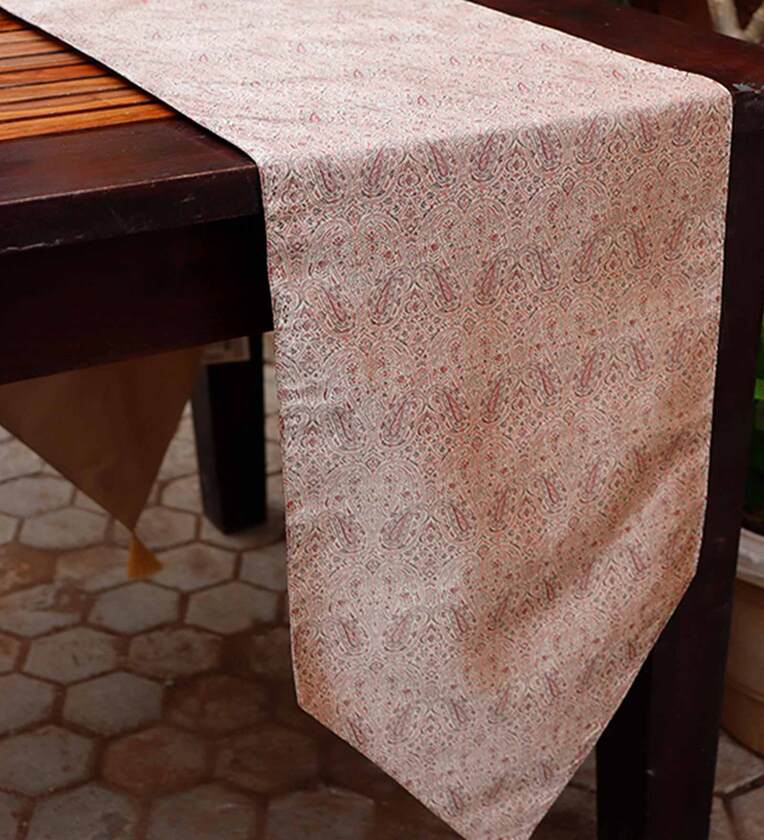 Exotic dinner settings has never been easier, inspired by authentic Indian motifs. This beautifully woven brocade fabric in soft colours with Paisley motifs is a treat to the eye, set on a dining table for a royalty feel. The perfect runner to create a stylish mood for your guests & family. The elaborately created fabric using beautiful tone on tone shades of colour is a piece of art. This well blended fabric with an intricate paisley pattern is a class of expression of rich. However, the price point makes it affordable for all & we all can feel royal using this table runner. Beautifully finished with a faux silk backing & metallic gold tassels.