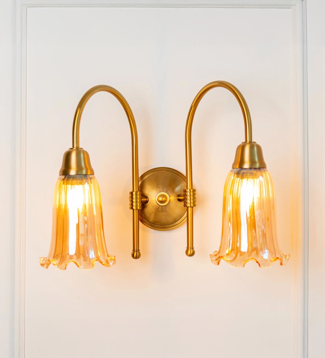 Double Hockey Wall Lamp Antique Brass Finish with Fluted Flower Glass Golden Luster