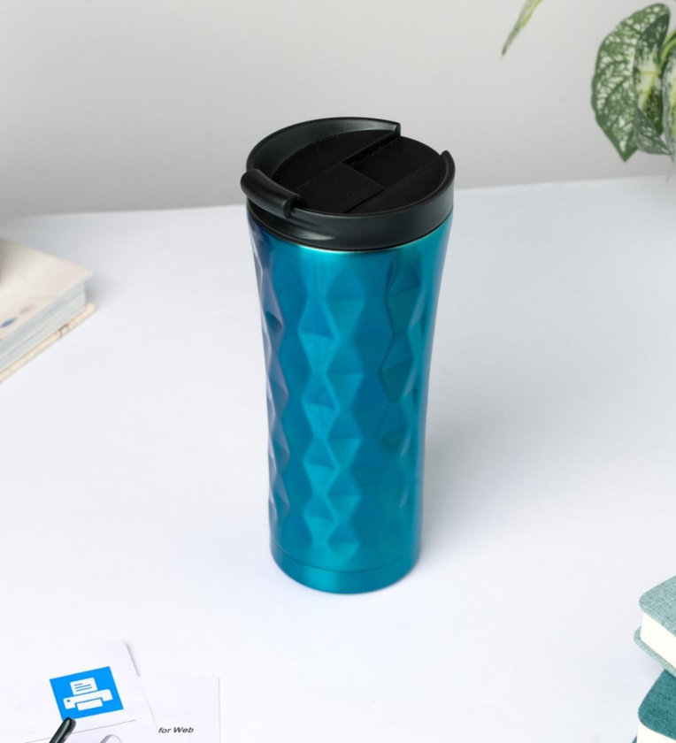 Pouring and drinking from the vacuum flask mouth cover with one hand is made simple by its unique leak-proof design. The blue tumbler's enticing and striking texture adds a diamond to its already impressive qualities. Features: -304 grade stainless steel -Unique texture -500ml capacity -BPA-free lockable flip lid -100% food grade -Leakproof -Durable -Rust proof -Keeps the liquid hot/cold for hours -Smudge resistant -Scratch resistant -Perfect for traveling, carrying to school/office